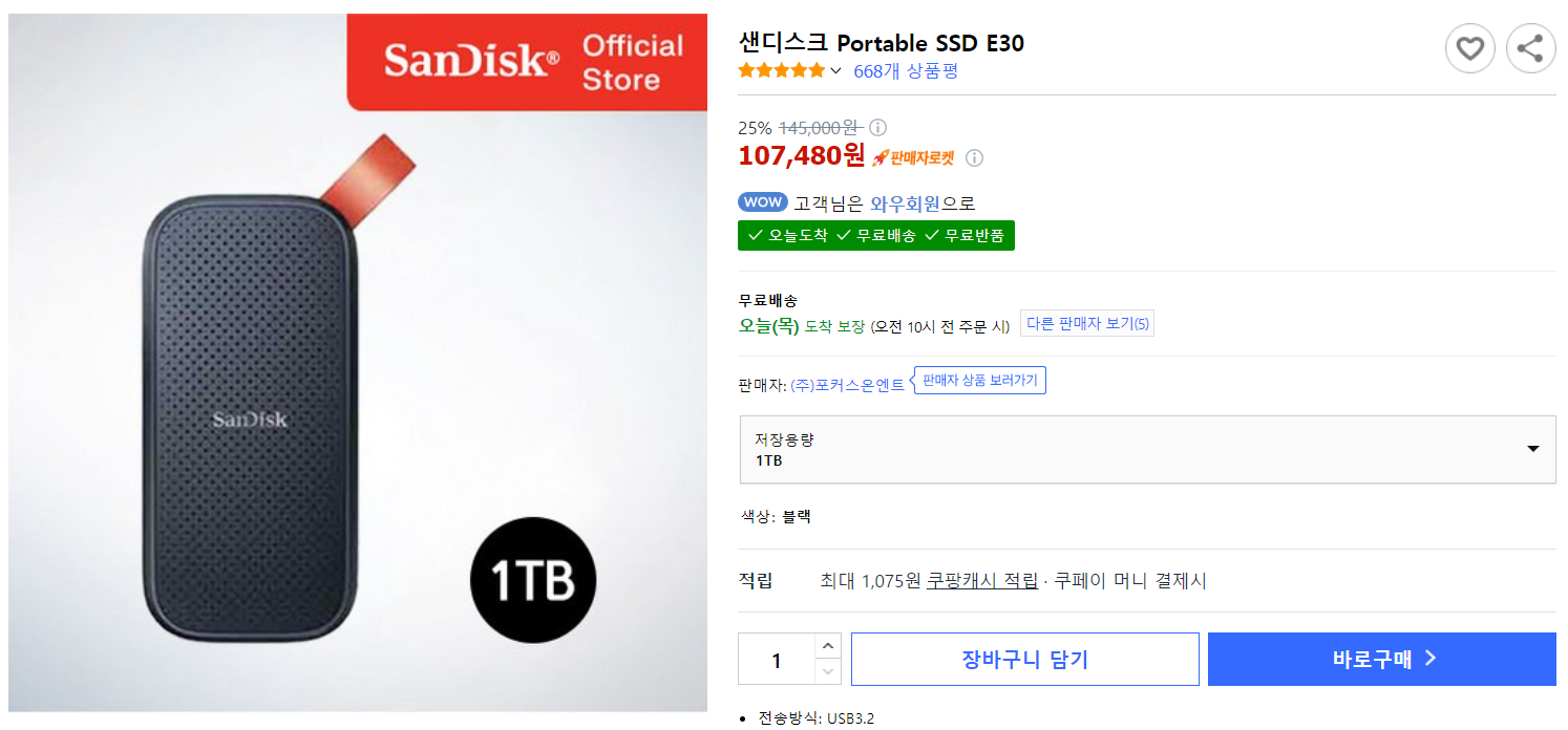 외장하드가 보편화되고 SSD 역시 많은 사용이 이뤄지면서 1TB SSD의 가격이 예전에 비해 많이 착해졌습니다. 1TB 외장하드 SSD를 구매하려는 참에 쿠팡에서 로켓배송으로 구매할 수 있는 외장하드 제품 중에 믿을 수 있는 브랜드와 가격이 적당한 SSD를 정리해보았습니다.