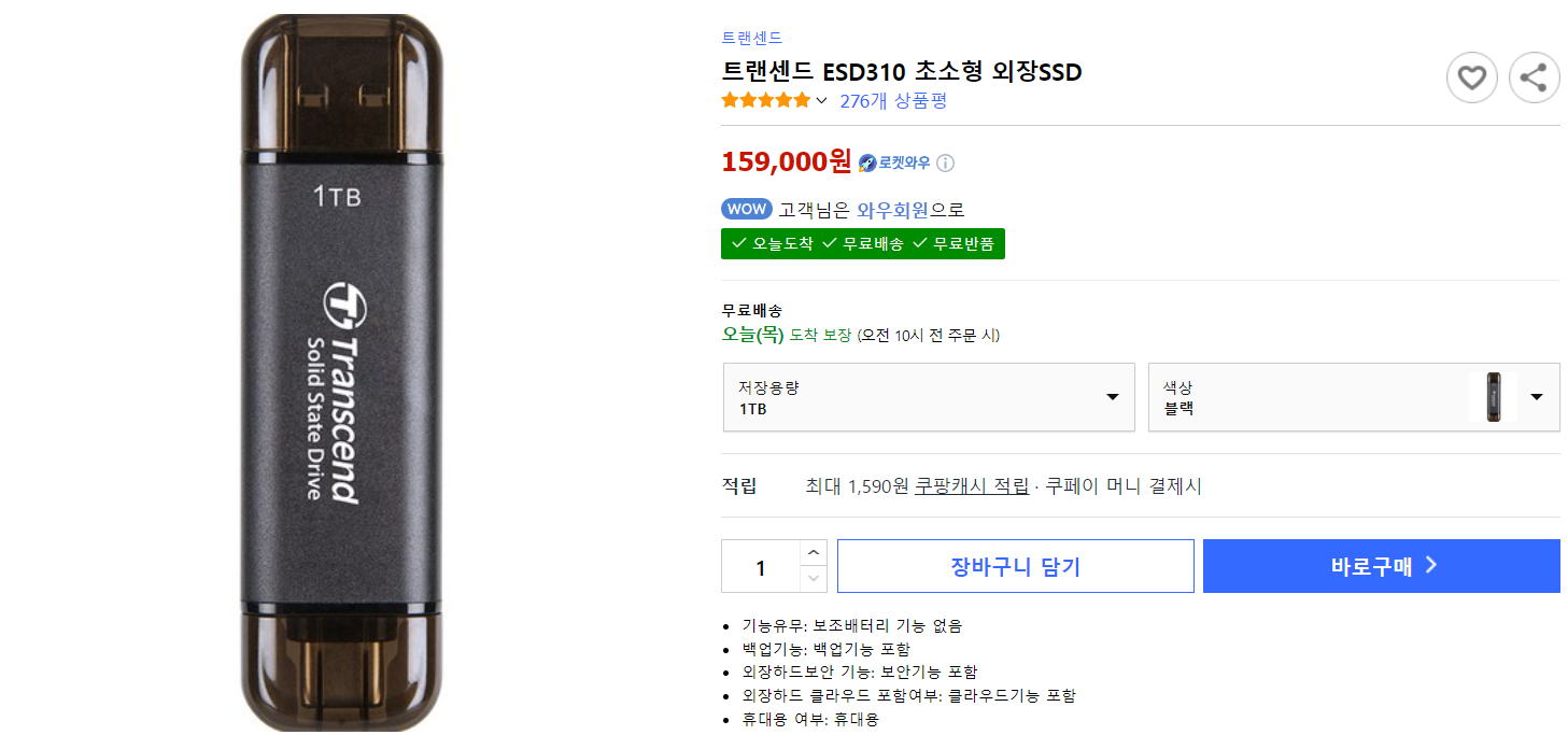 외장하드가 보편화되고 SSD 역시 많은 사용이 이뤄지면서 1TB SSD의 가격이 예전에 비해 많이 착해졌습니다. 1TB 외장하드 SSD를 구매하려는 참에 쿠팡에서 로켓배송으로 구매할 수 있는 외장하드 제품 중에 믿을 수 있는 브랜드와 가격이 적당한 SSD를 정리해보았습니다.