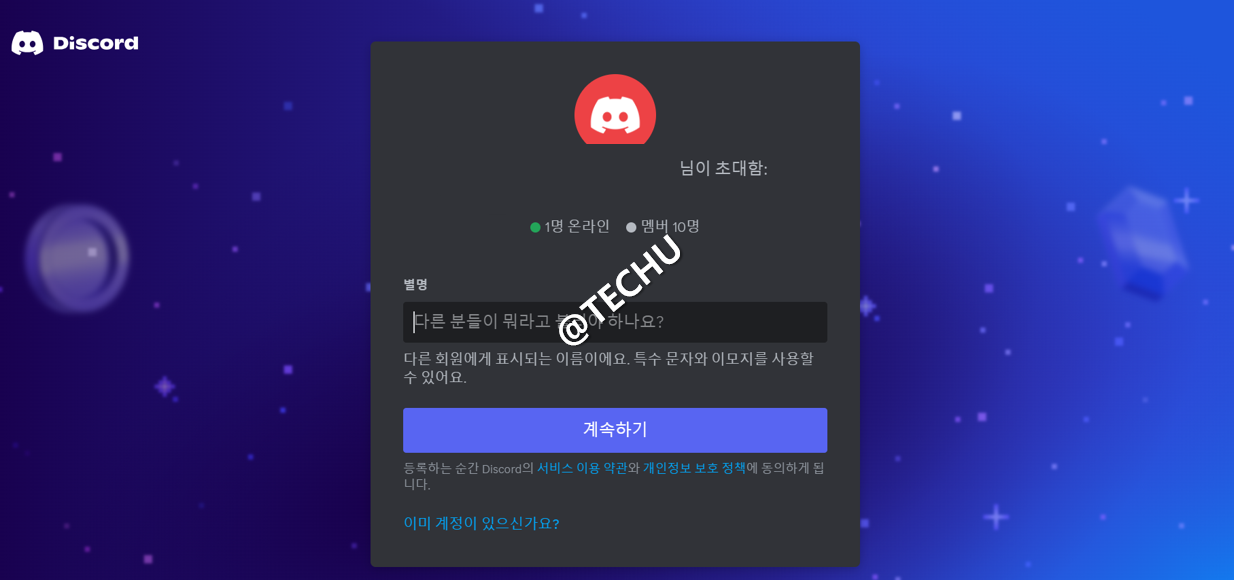 다른 사람이나 단체의 서버에 접속해서 합류하고 싶다면, 서버 운영자가 발행한 초대장(초대링크주소)을 통해 합류할 수 있습니다. 초대링크로 접속을 하면 이미지와 같이 초대장이 나오고 입력하는 단계를 거쳐서 합류하여 활동할 수 있게 됩니다.