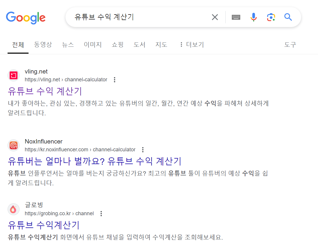 구글에 유튜브 수익계산기를 검색하면 몇 가지 유튜브 수익계산기 사이트가 나옵니다. 몇 년 전부터 있던 사이트가 NoxInfluencer이고 vling, grobing 이런 거는 새로 생긴 것 같습니다. 이 사이트들 중에 하나를 들어가보면 우리가 주로 시청하는 유튜버들의 수익을 계산할 수 있습니다. 그럼 더 자세히 알아보도록 하겠습니다.