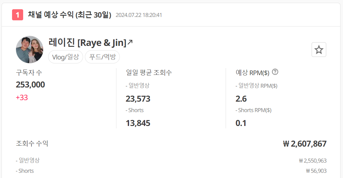 그럼 20만 유튜버는 수익이 얼마일까요? 미국 브이로그를 올리는 레이진 채널은 구독자수가 25만이고, 월 조회수 수익은 260만원 정도됩니다. 일 평균 조회수가 2만3천 정도네요. 구독자수는 이사벨 아빠 채널보다 10만명이나 많지만, 조회수는 절반 정도 적게 나오기 때문에 월 수익은 이사벨 아빠가 450만원 정도인 것에 비해 절반 정도를 내고 있습니다.