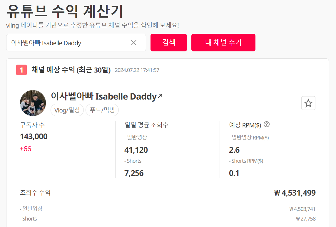 우선 무료로 볼 수 있는 기능은 조회수 수익, 일일 조회수, 쇼츠 수익 등입니다. 제가 즐겨보는 이사벨아빠 채널은 14만 구독자를 보유하고 있고, 월간 조회수 수익은 450만원 정도가 나온다고 유튜브 수익계산기에서 알려주고 있습니다. 월 450만원 정도 수익을 내기 위해서는 일 평균 조회수가 4만회 이상 나와야 하네요. 이사벨아빠 채널은 브이로그, 한국 음식 먹방이 주요 콘텐츠이고 영상의 길이는 10분 이상으로 긴 편입니다.
