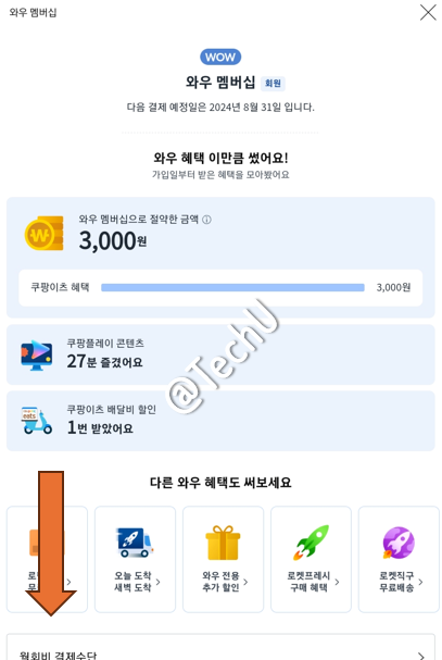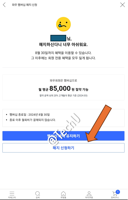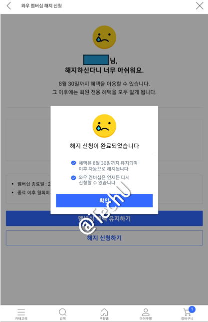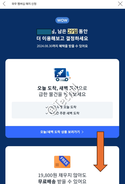 자 비로소 여기까지 와야 쿠팡 와우 회원 월회비 결제가 더 이상 출금되지 않도록 해지가 됩니다. 만약에 8월 1일에 와우 회원에 가입했다면 8월 31일까지 1개월치 납부한 월회비 만큼의 혜택은 이용할 수 있습니다. 와우 회원 해지는 자동결제를 해지하는 개념이라고 생각하면 됩니다.