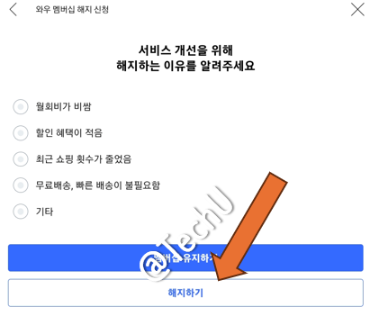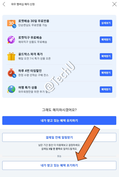 또다시 와우 회원이 누릴 수 있는 혜택을 나열하며 해지하지 않도록 하기 위한 장치를 보여줍니다. 이것도 무시하시고 아래로 쭉 내리면 선택할 수 있는 버튼이 나옵니다. 내가 받고 있는 혜택 포기하기를 선택합니다. 또 여기에서 끝이 아닙니다.