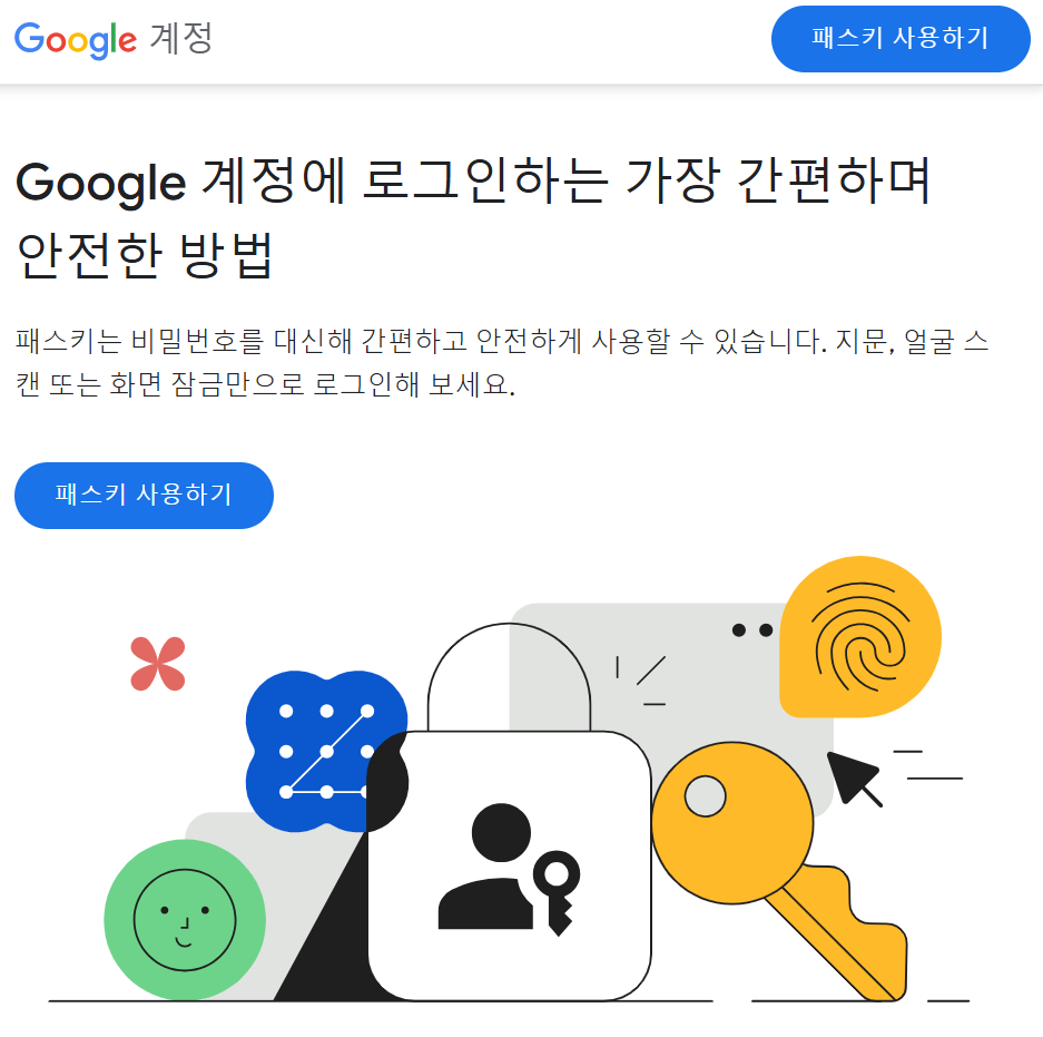 패스키는 구글, 애플, 마이크로소프트, FIDO Alliance가 협력하여 개발한 차세대 로그인 방식으로, 전통적인 비밀번호보다 훨씬 안전하게 계정을 보호할 수 있는 수단을 제공합니다. 얼굴 인식이나 지문 인식 같은 생체 인증을 통해 간편하게 Google 계정에 로그인할 수 있습니다. 패스키는 2022년 하반기에 애플이 처음 도입했으며, 2023년 10월 11일부터 구글에서도 기본 인증 방식으로 사용되고 있습니다. 더욱 안전하게 구글 계정을 이용하고자 할 때 비밀번호 대신 패스키를 사용하면 좋습니다.
