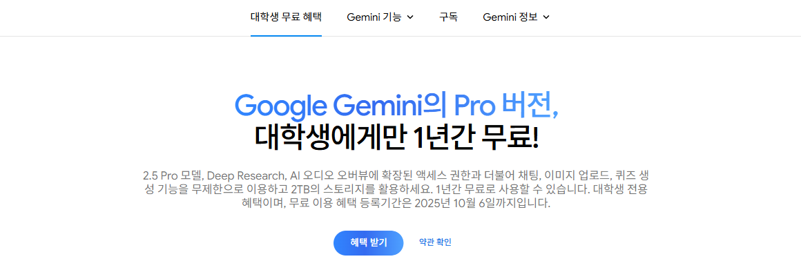 구글 검색창에 '제미나이 대학생'이라는 검색어로 검색을 하면 gemini google에서 제공하는 전용 웹사이트를 찾을 수 있습니다. 해당 사이트에 접속하면 화면과 같이 대학생에게 제미나이 프로 버전을 무료로 1년간 제공한다고 대문짝만하게 알려주고 있습니다.