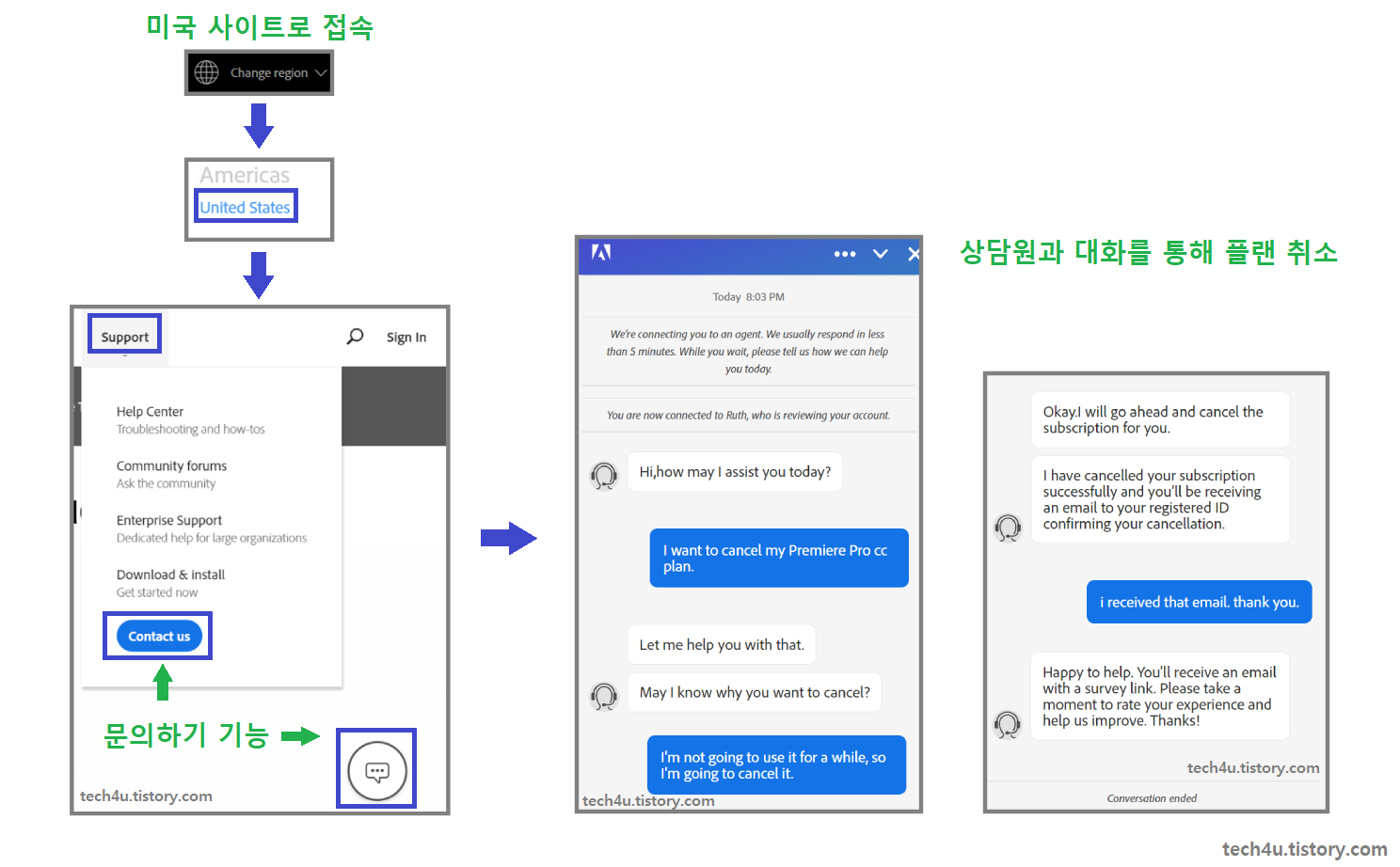 저의 경우는 상담원이 'Hi,how may I assist you today?'라고 말을 걸어왔고, 저는 'I want to cancel my Premiere Pro CC plan.'이라고 대답했습니다.