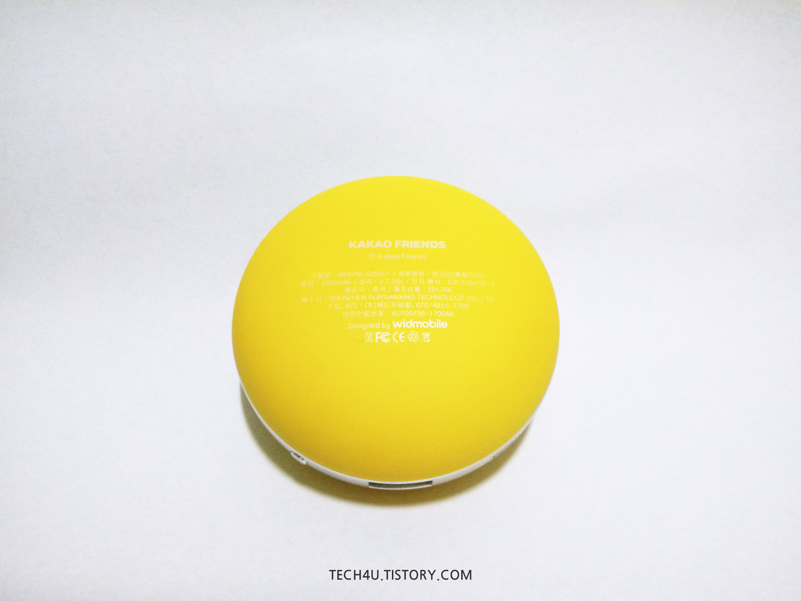 앞면에는 보시다시피 너무도 귀여운 무지 얼굴이 그려져 있구요. 뒷면에는 제품에 대한 정보가 적혀있습니다. 실제로 뒷면을 보면 글씨가 잘 안 보이는데요. 사진에 나오게 찍으려고 좀 힘들었습니다. ㅎㅎ 모델명은 WKFPB-4350C1 이고, 용량은 4350mAh 입니다.