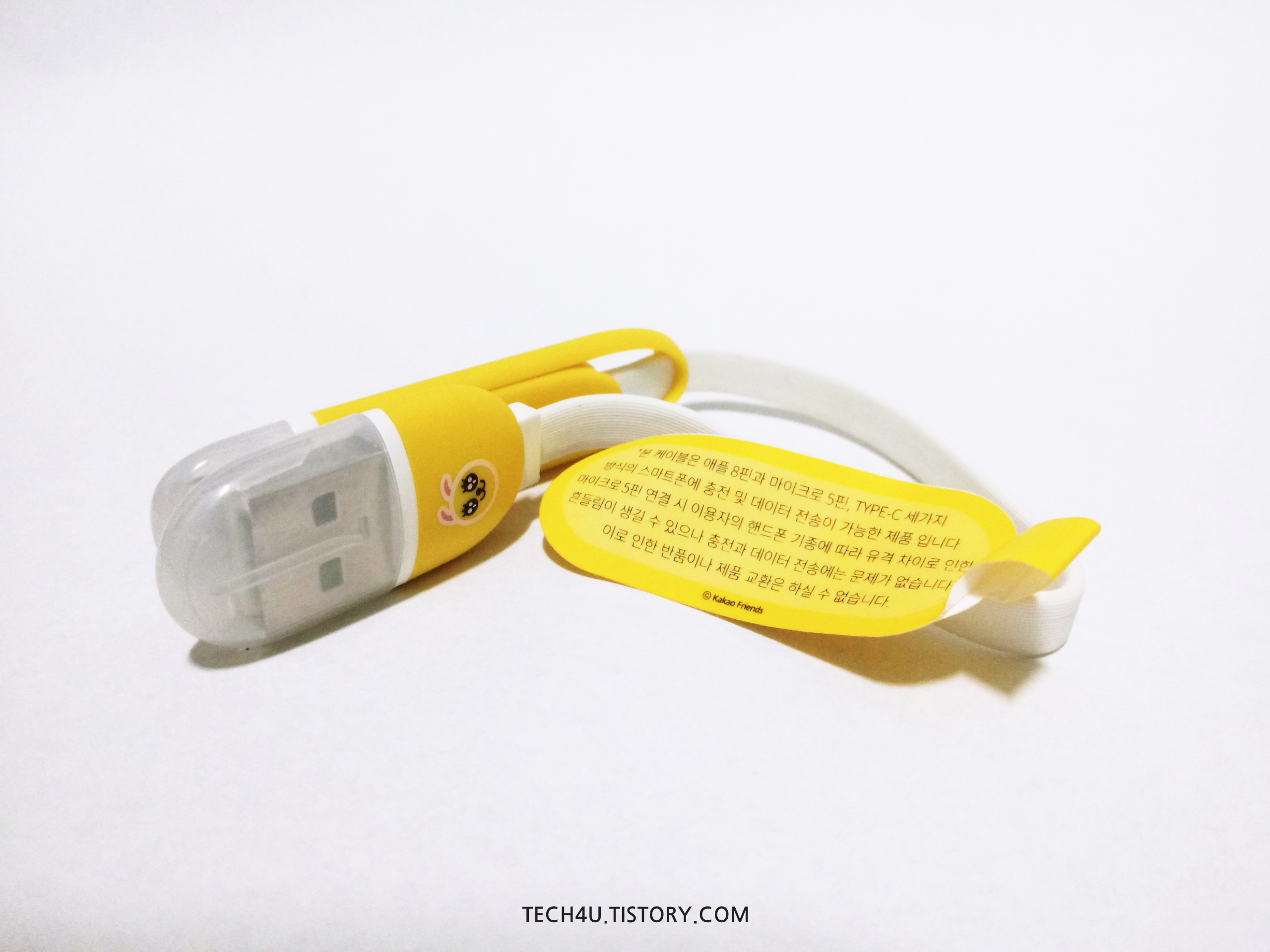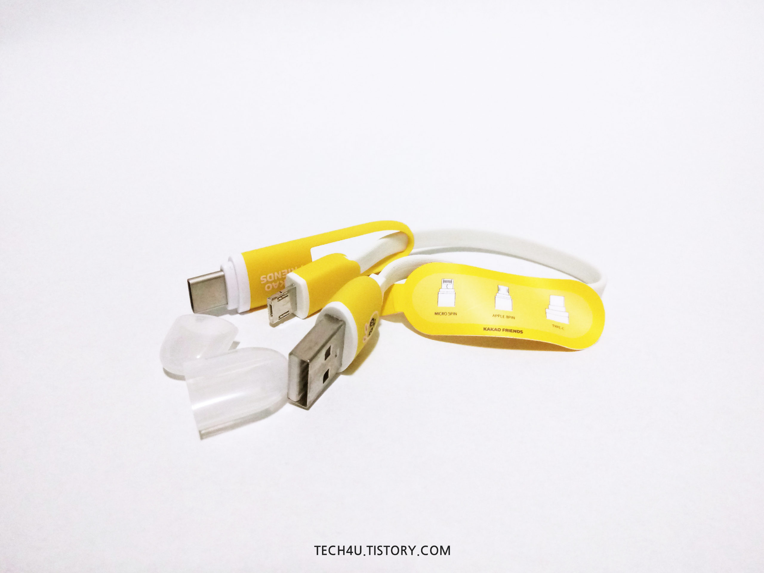 이것은 충전 케이블인데요. 여기도 앙증맞게 카카오 캐릭터가 깨알같이 그려져 있습니다. 단자는 보호캡으로 보호할 수 있게 되어 있구요. 마이크로 5핀, TYPE-C, 애플 8핀 세 가지 단자를 지원합니다. 저는 5핀 형식의 스마트폰을 사용하고 있어서, 5핀 단자를 쏘옥 빼서 이용하고 있습니다.