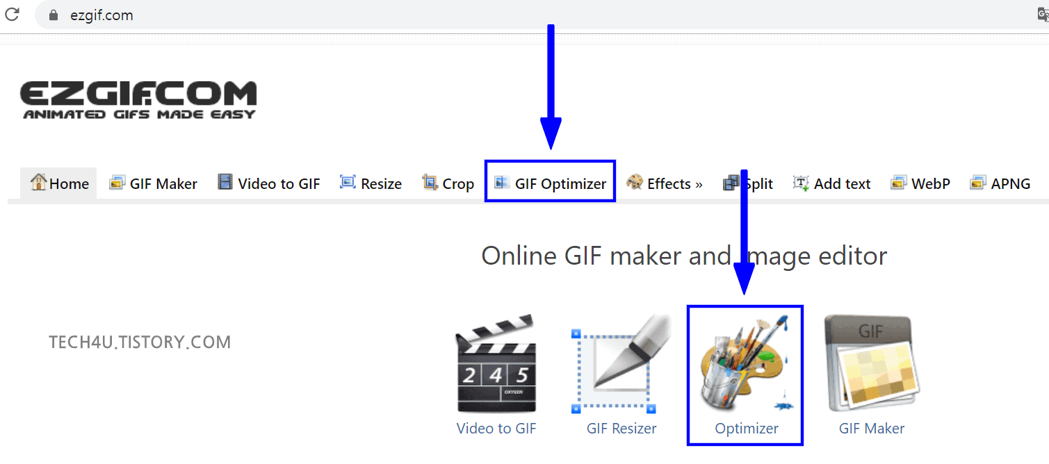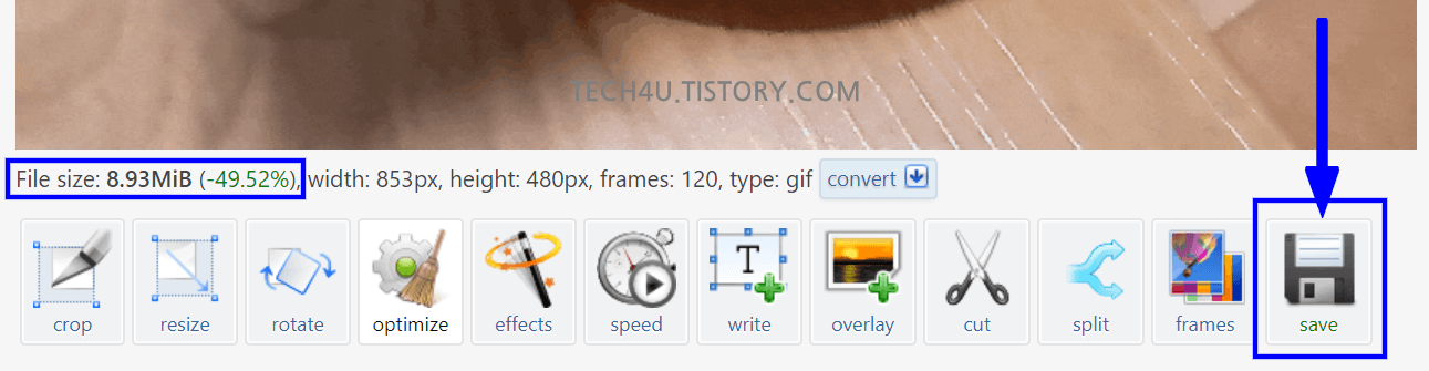 GIF 파일로 변환하기 위해 EZGIF라는 사이트를 이용했는데요. 해당 웹사이트에서 GIF 파일의 용량을 줄이는 기능도 제공하고 있습니다.