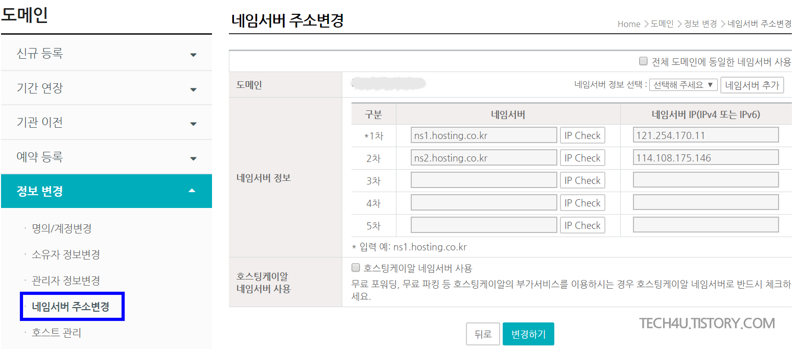 도메인을 구입한 업체의 사이트에 방문해서, 네임서버 정보를 변경해 줍니다. 도메인을 바로 다른 서비스로 연결하지 않을 것이라면, 도메인 업체의 네임서버로 변경을 해 둡니다. 나중에 다른 서비스를 이용해서 내 사이트에 도메인을 연결할 때 네임서버를 다시 변경하면 됩니다.