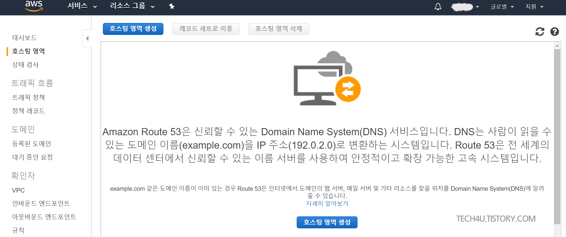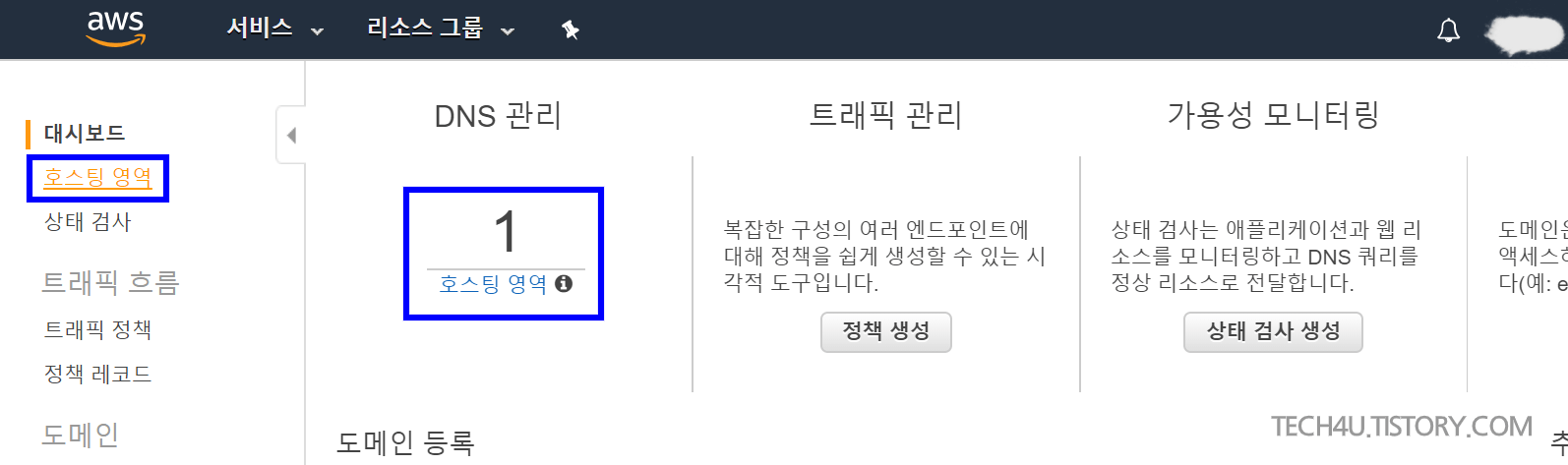 대시보드 화면이 기본으로 나타나게 됩니다. 여기에서, 왼쪽 사이드바 메뉴의 호스팅 영역 항목을 선택합니다. (예시 화면에서는 현재 가동되고 있는 서비스가 1개 이므로, 호스팅 영역에 1개가 표시되어 있습니다.)