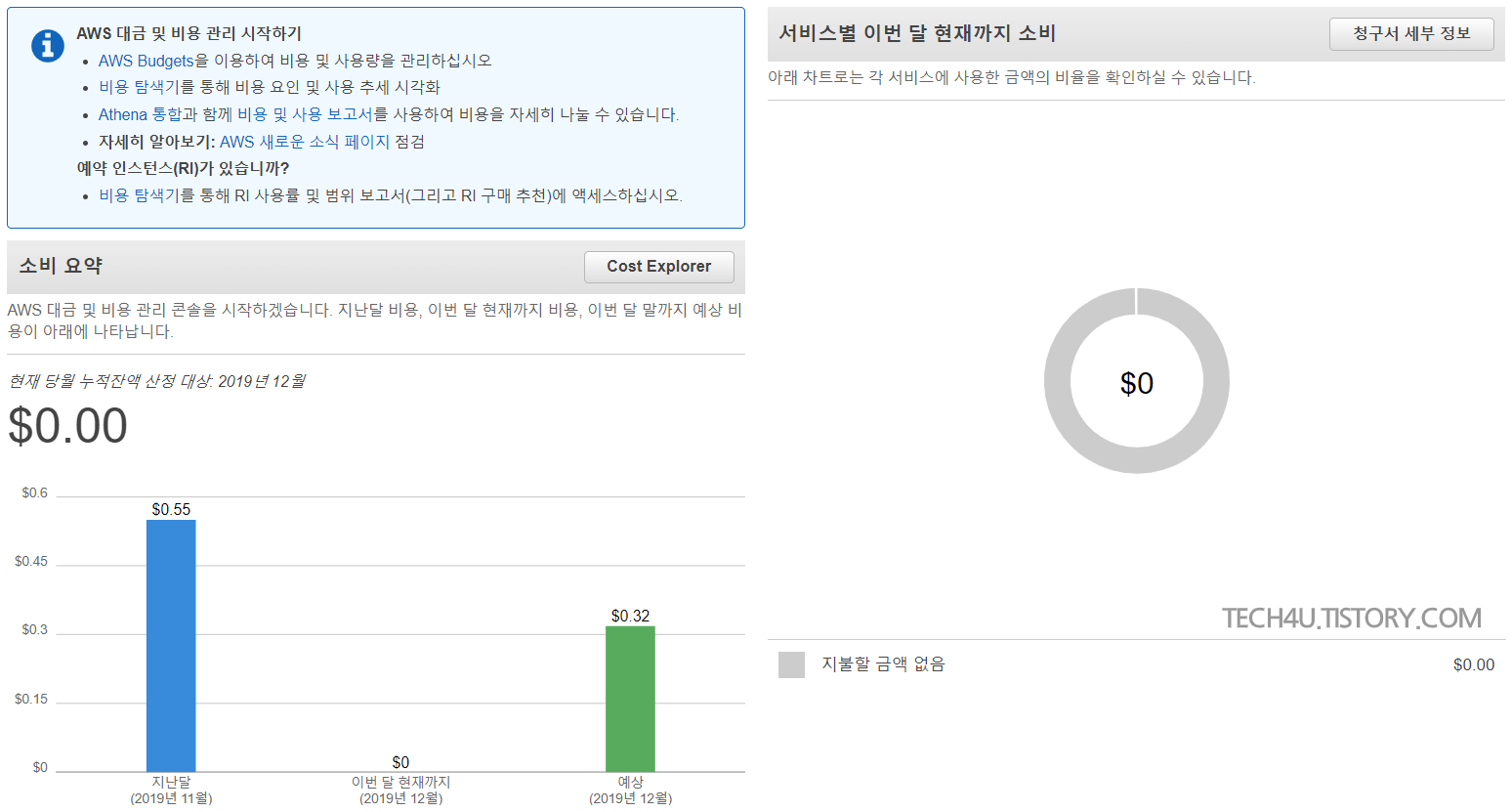 AWS 결제 대시보드로 들어가서 제대로 해지가 되었는지 확인을 하겠습니다. 프리티어를 사용하고 있는 계정에 Route 53을 이용하여 도메인을 연결했을 때, $0.55씩 부과되던 요금이 $0으로 바뀐 것을 확인할 수 있습니다. 여기까지 AWS Route 53을 해지하는 방법이었습니다.