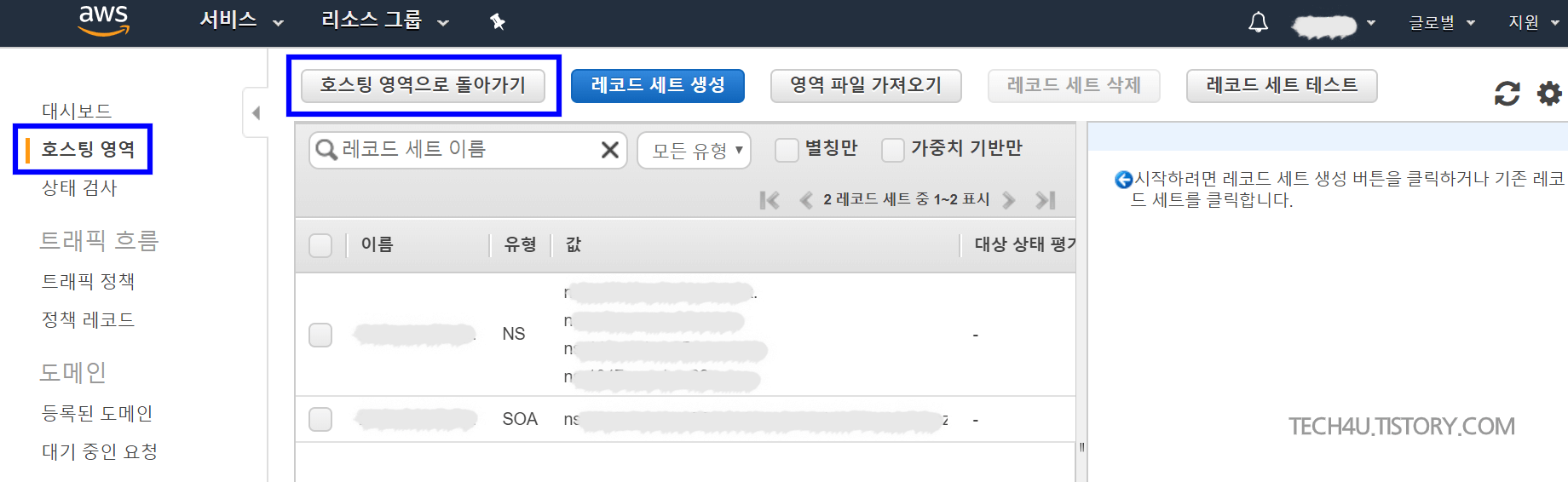 이 상태에서 호스팅 영역으로 돌아가기를 클릭합니다. (이 단계에서 NS와 SOA 레코드 세트는 남아 있는 것이 정상입니다.)