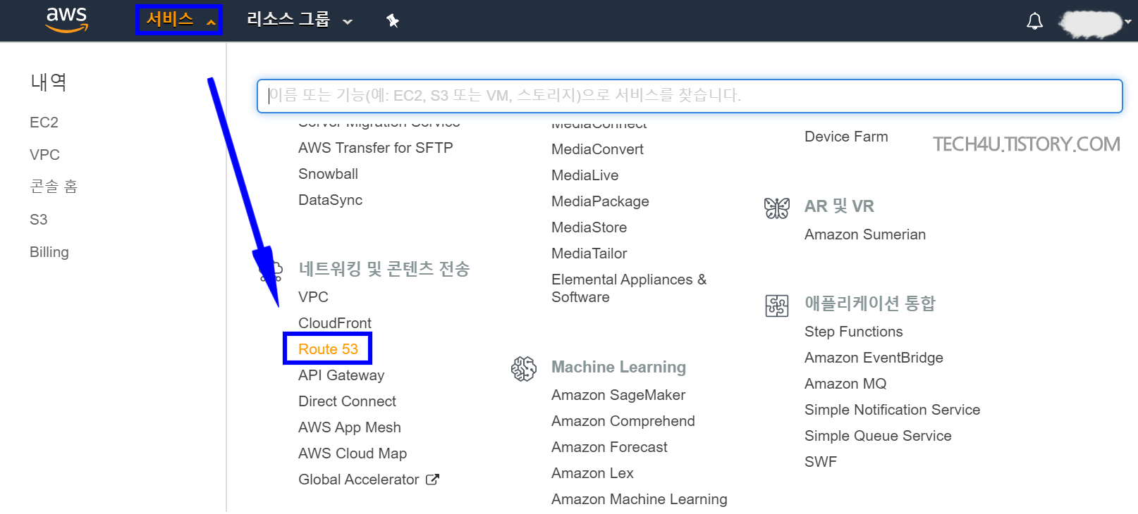 AWS 사이트의 상단 메뉴에서 서비스를 클릭합니다. 네트워킹 및 콘텐츠 전송 항목에서 Route 53을 선택해 줍니다.