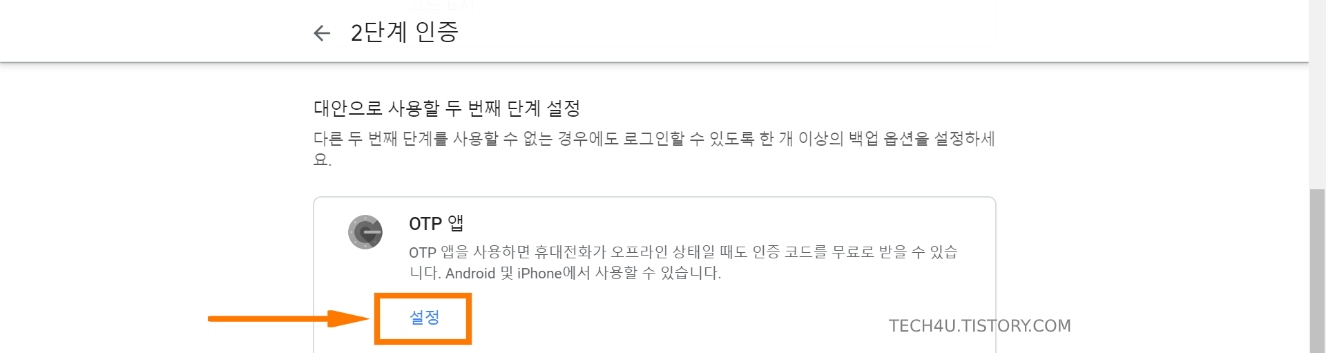 여기에서 OTP 앱 항목의 설정을 눌러줍니다.