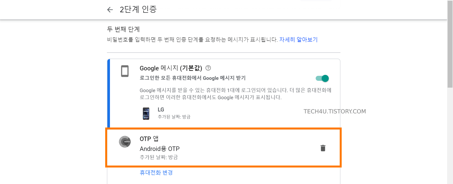 인증 수단에 OTP 앱이 추가된 것을 확인할 수 있습니다.