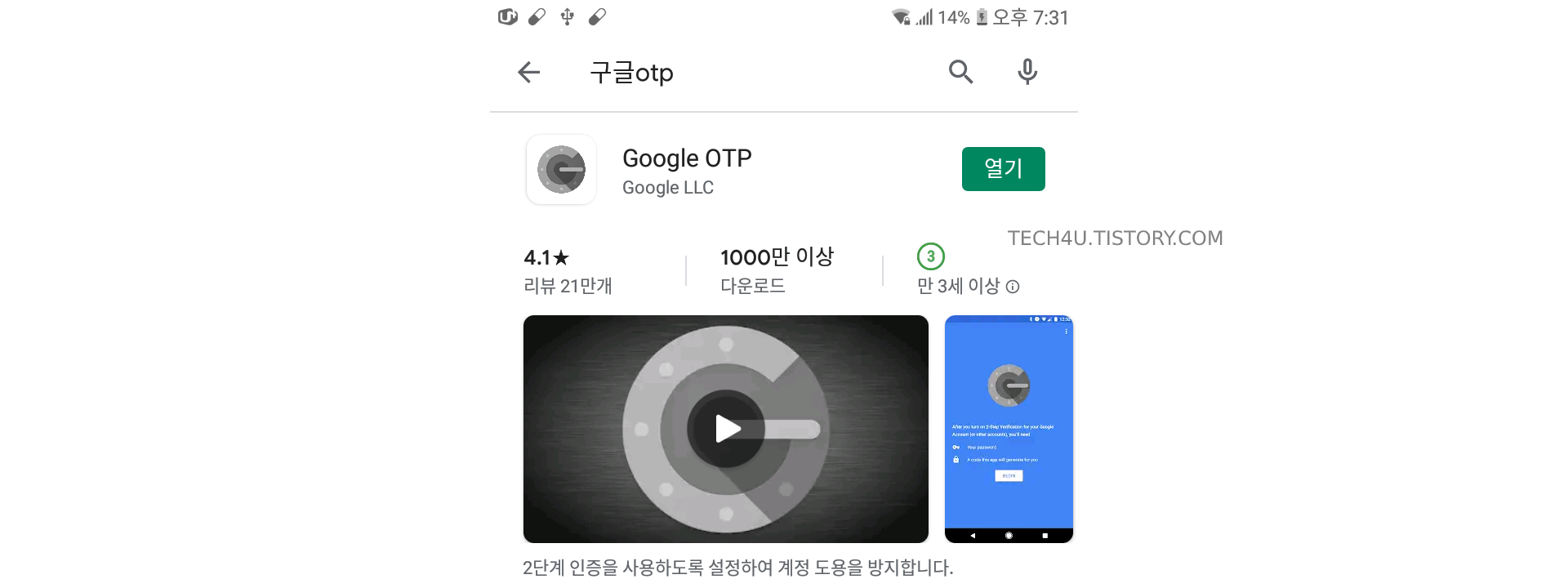 플레이스토어 혹은 앱스토어에서 구글 OTP를 검색한 후, 해당 앱을 설치해 줍니다.