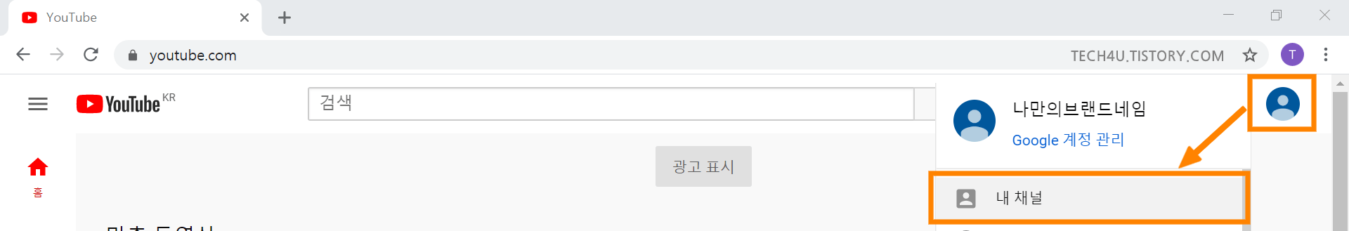 아까는 구글 계정의 아이콘으로 표시가 되었던 것이, 새로 만든 채널로 표시가 됩니다.