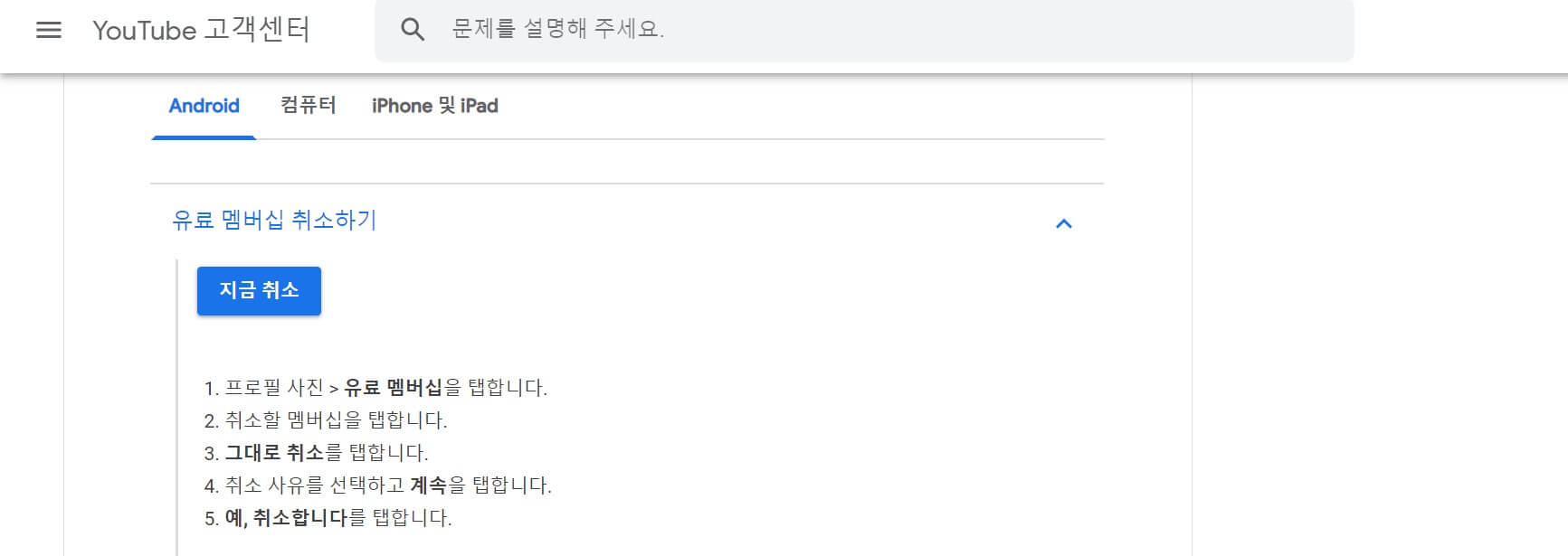유튜브 고객센터 사이트를 살펴보면 해지 방법을 안내하고 있습니다. 총 5단계에 걸쳐서 해지 과정을 설명해 두었습니다. 이렇게 하면 유튜브프리미엄해지를 완료할 수 있습니다.