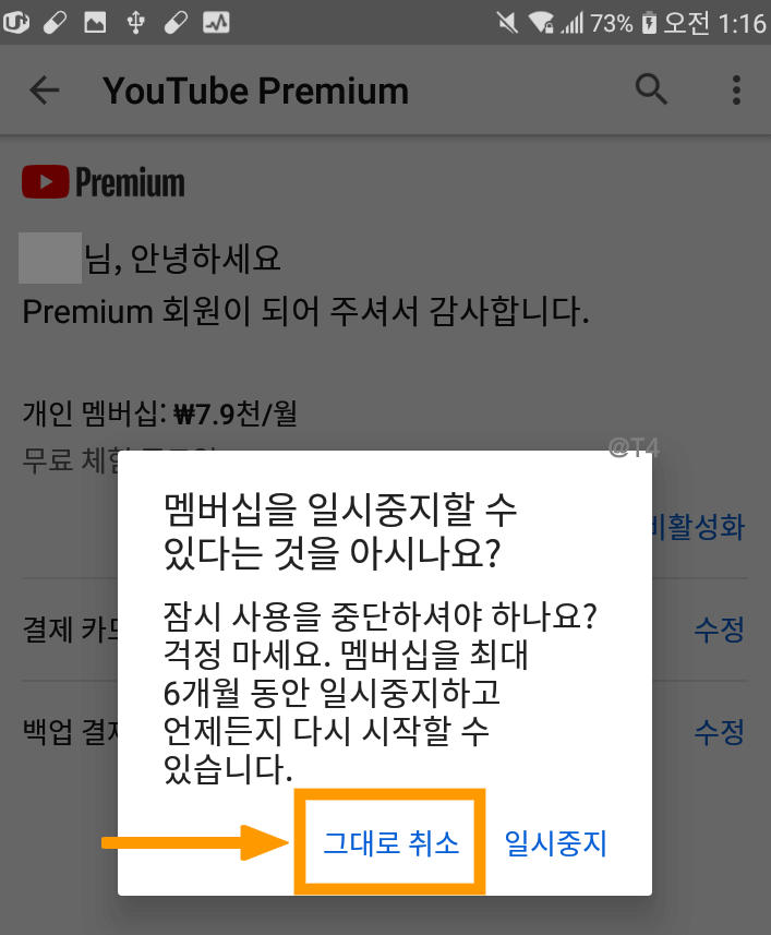 그렇지 않고, 지금 바로 유튜브프리미엄 멤버십을 해지하려는 분은 그대로 취소를 눌러줍니다.