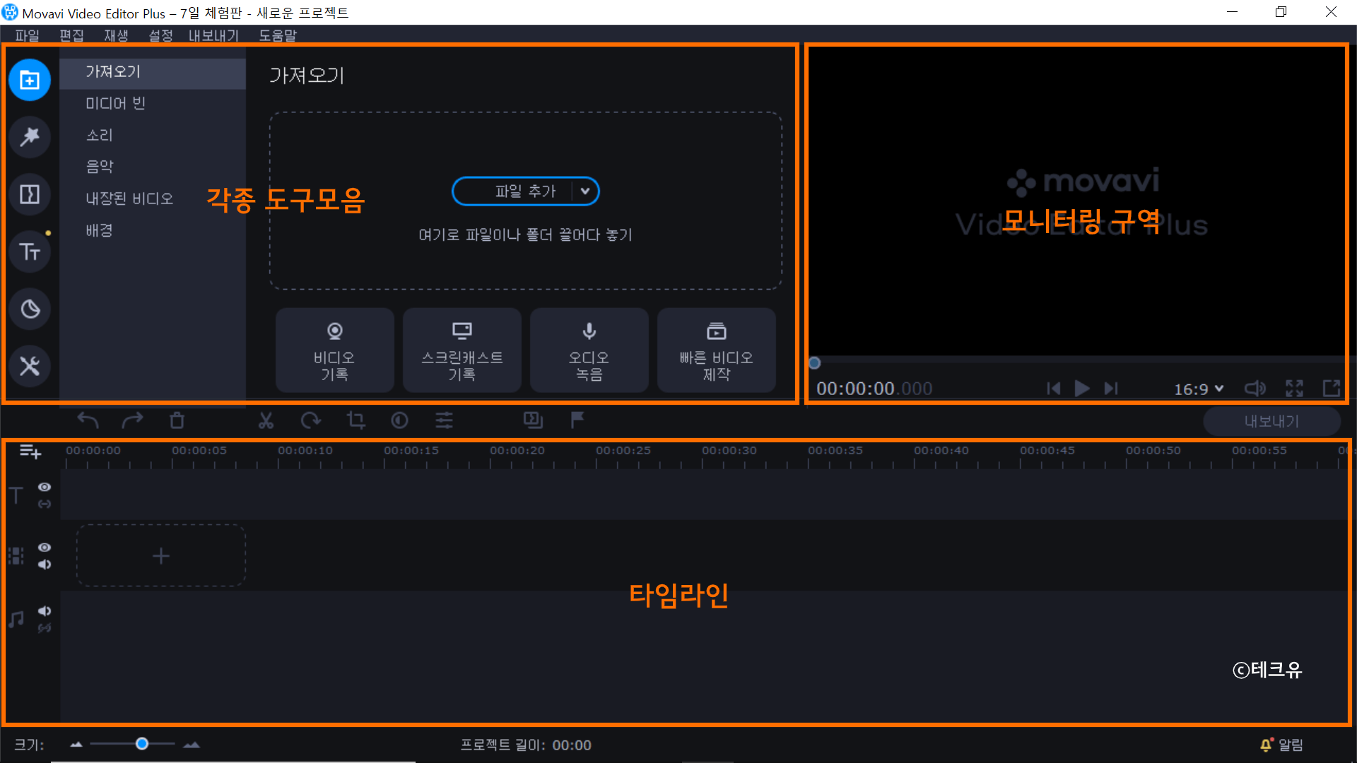 인터페이스가 아주 심플하게 구성되어 있습니다. 각종 도구모음 영역과 모니터링 영역, 그리고 타임라인이 있습니다. 타임라인이 본격적인 작업 공간이라고 생각하시면 되겠습니다.