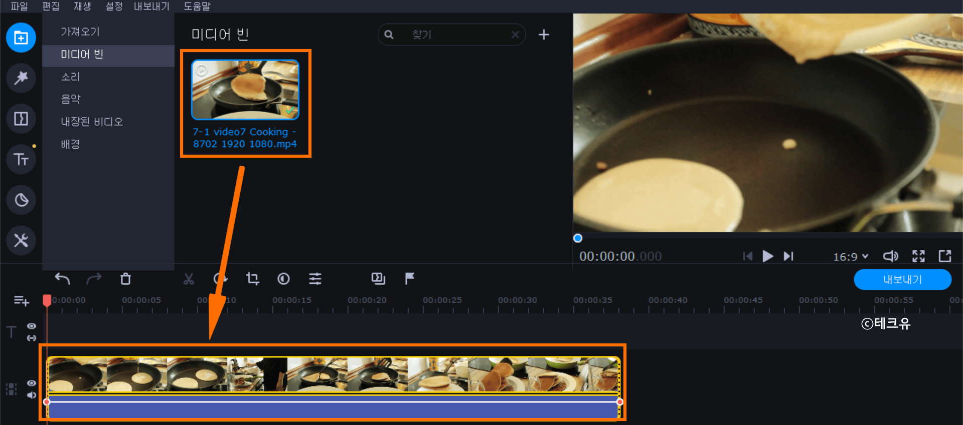 편집할 비디오 파일을 미디어 영역에 추가하면, 파일의 미리보기 화면이 보입니다. 파일의 이름과 영상의 대표 이미지가 함께 나오므로 사용할 파일을 찾기가 더욱 수월합니다. 추가한 미디어 파일을 타임라인 영역에 끌어다 놓으면 자동으로 추가가 됩니다.
