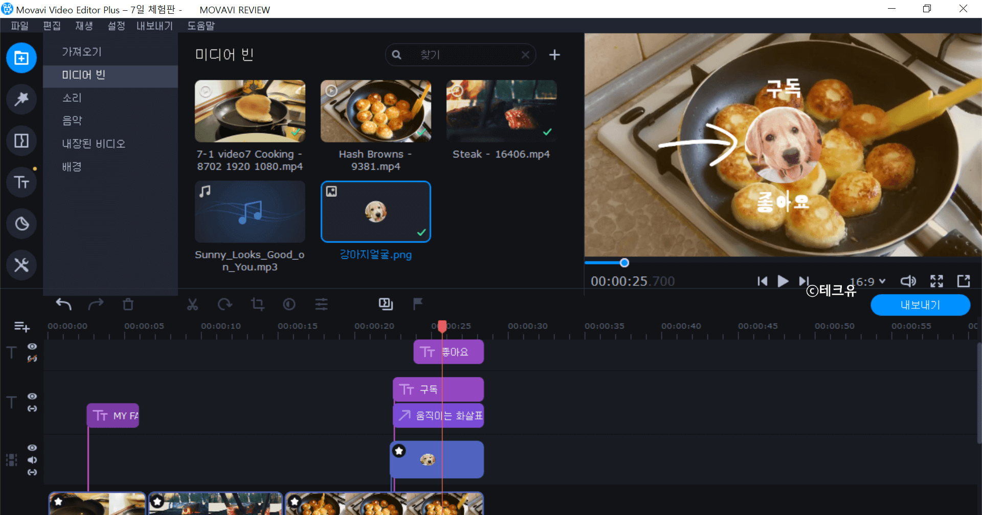 제가 리뷰를 위해 편집하는 장면입니다. 영상 파일 위에 이미지도 넣을 수 있고, 각종 텍스트도 넣을 수 있습니다. 움직이는 아이콘도 템플릿으로 준비되어 있어서 쉽게 편집할 수 있습니다. 한글과도 100% 호환이 되어 오류가 나지 않았습니다.