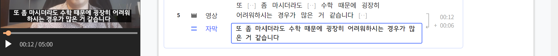 이런 경우에는 그 부분만 수동으로 수정을 해 주면, 영상 자막에 자동으로 수정된 글자가 반영이 됩니다.
