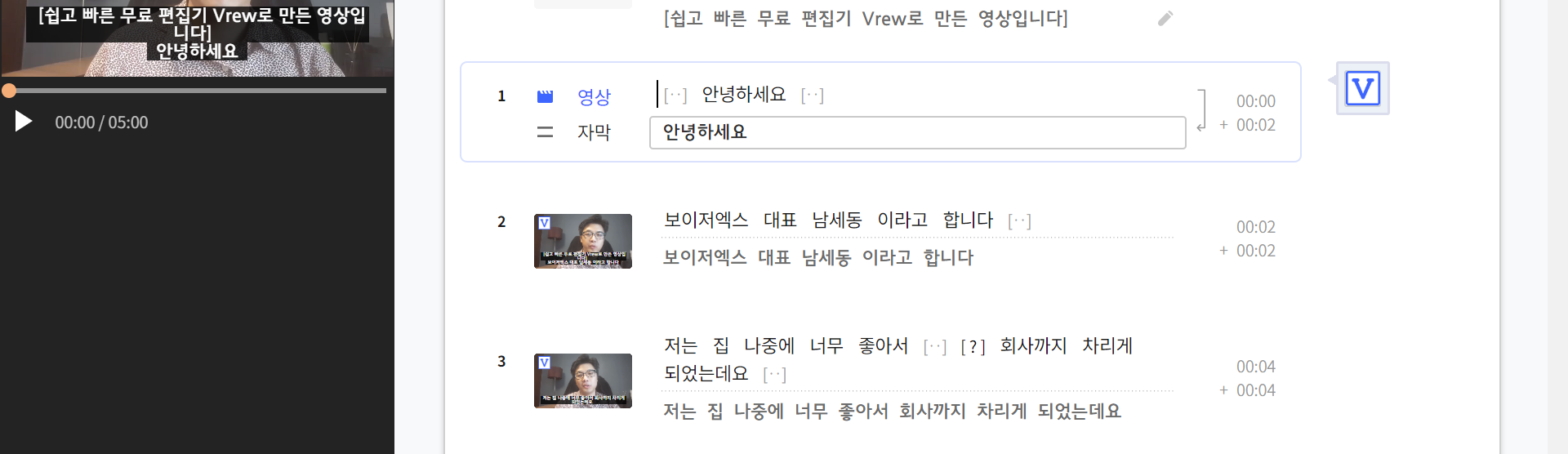 VREW 홈페이지를 방문하여 위 예시 화면과 같이 프로그램을 체험해 볼 수 있는데요.