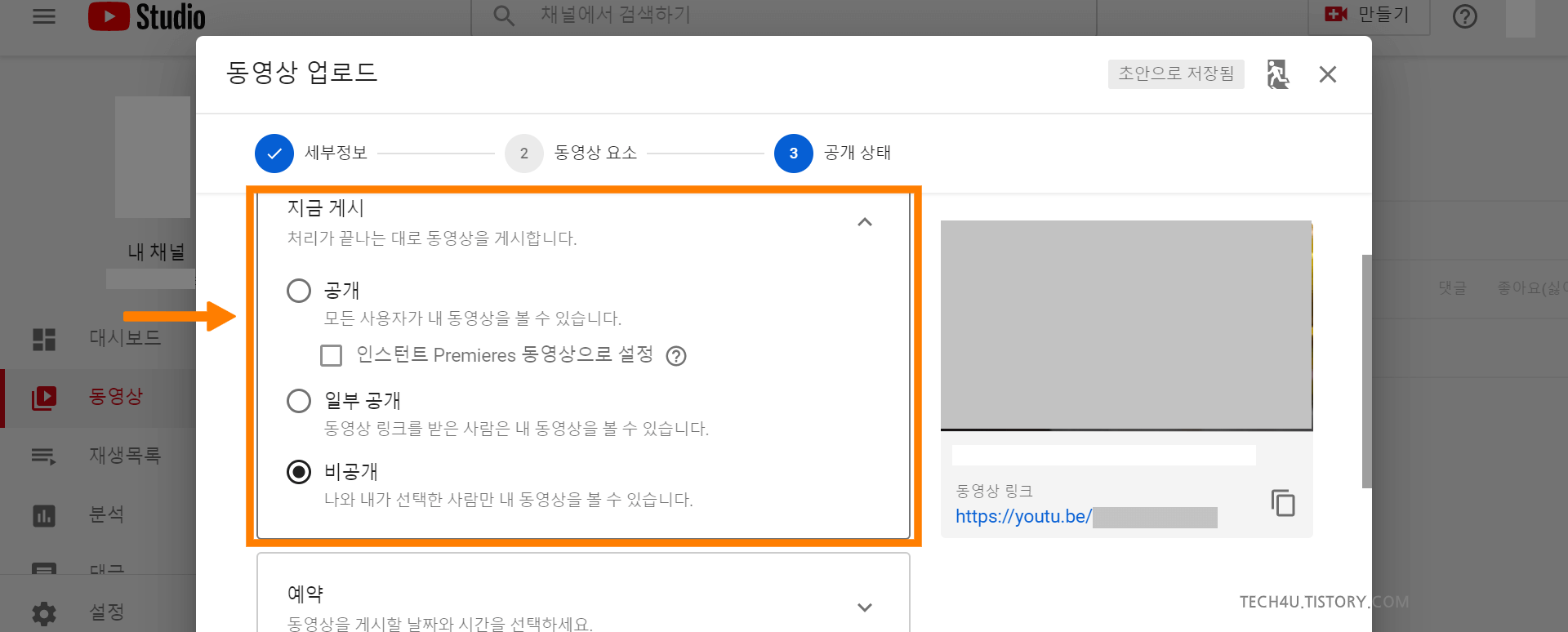 다음으로 넘어가면 영상의 공개, 일부 공개, 비공개를 설정할 수 있습니다.