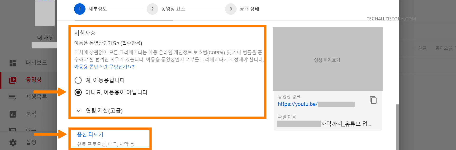 일반적인 영상은 아동용이 아닌 것이 더 많을 것입니다. 그럴때는 아동용이 아닙니다를 선택합니다.