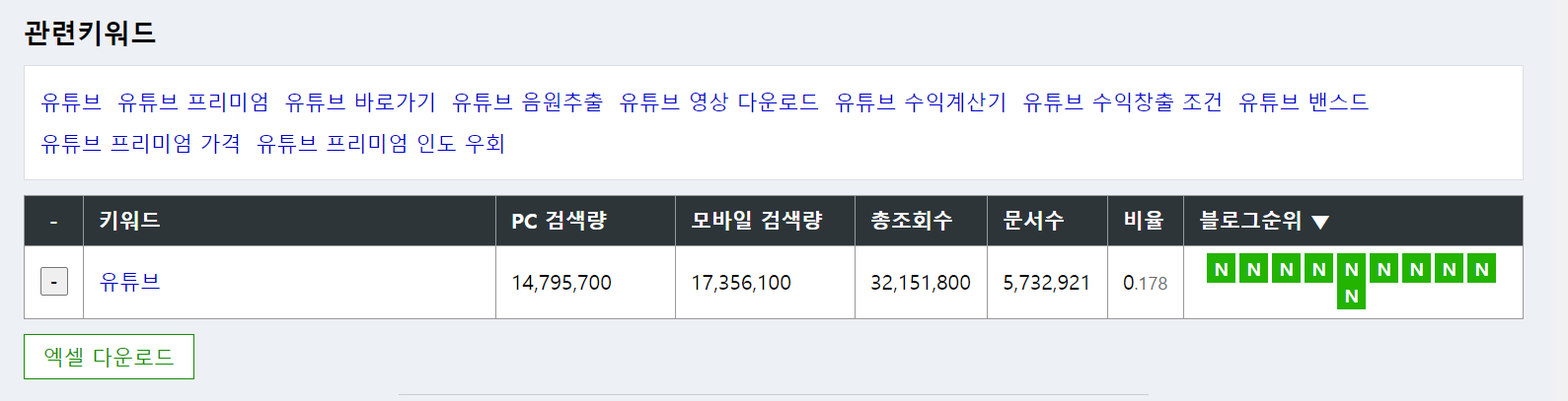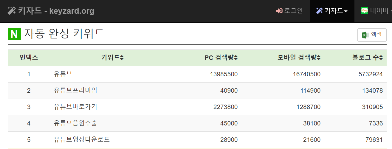 찾은 키워드검색량조회 결과를 엑셀파일로도 이용할 수 있습니다.