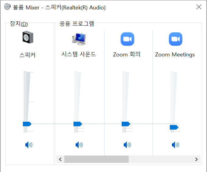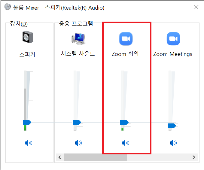 그걸 보고 소리가 나오고 있는 (여기에서는 줌회의) 항목의 파란색 화살표 모양을 위아래로 움직이면 볼륨을 조정할 수 있습니다.