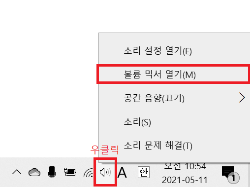 그냥 클릭하면 컴퓨터 전체 볼륨만 조정가능하니, 꼭 우클릭해야 합니다.