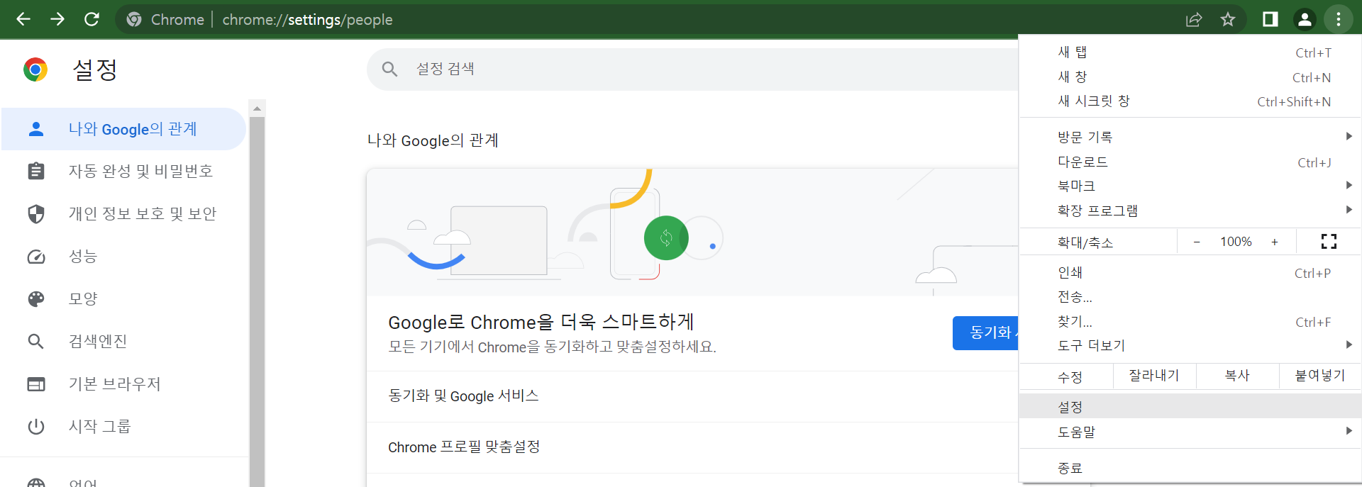 1. 크롬을 실행하여 우측 상단의 점 3개 아이콘을 눌러 설정 모드로 진입합니다.